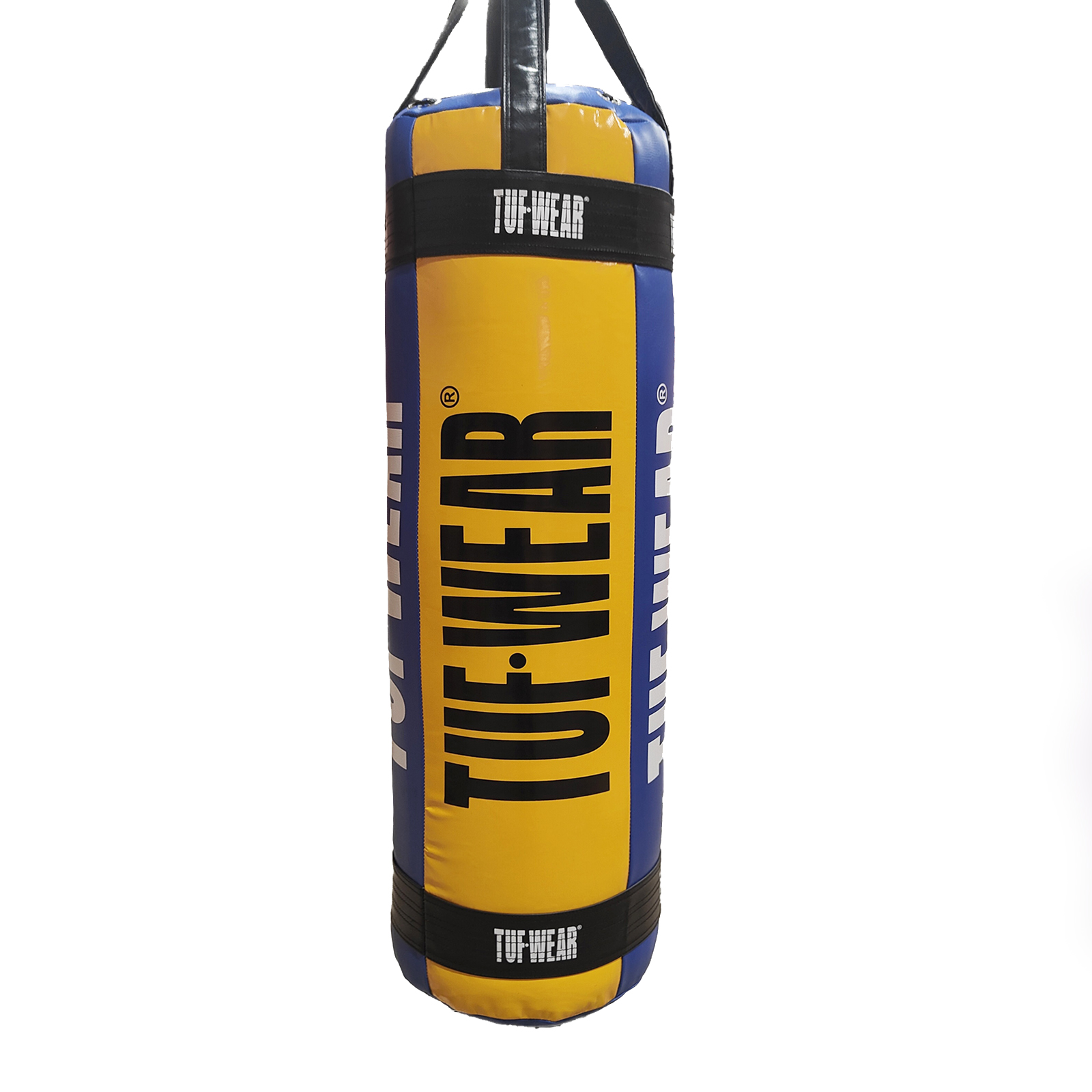 The Tuf Wear Balboa 4FT Straight punchbag is crafted in a heavy duty synthetic leather in a blue/yellow colourway. The punchbag weighs in at approx 40kg and with a 15 inch diameter. Complete with 4 hanging straps to sit proudly within your gym.
